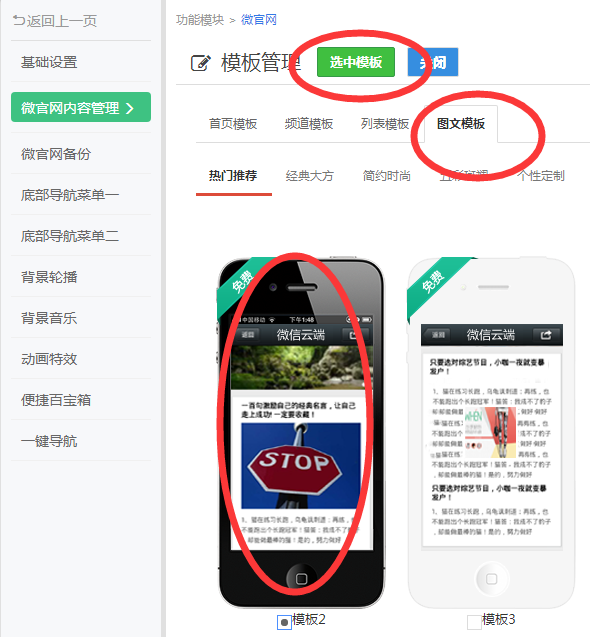 那小伙伴们又要问了,微官网模板页面都有了,那具体的文章内容在哪里添加呢?这个当然可以添加具体的内容,比如新建一个页面,选择图文模板。(下图)