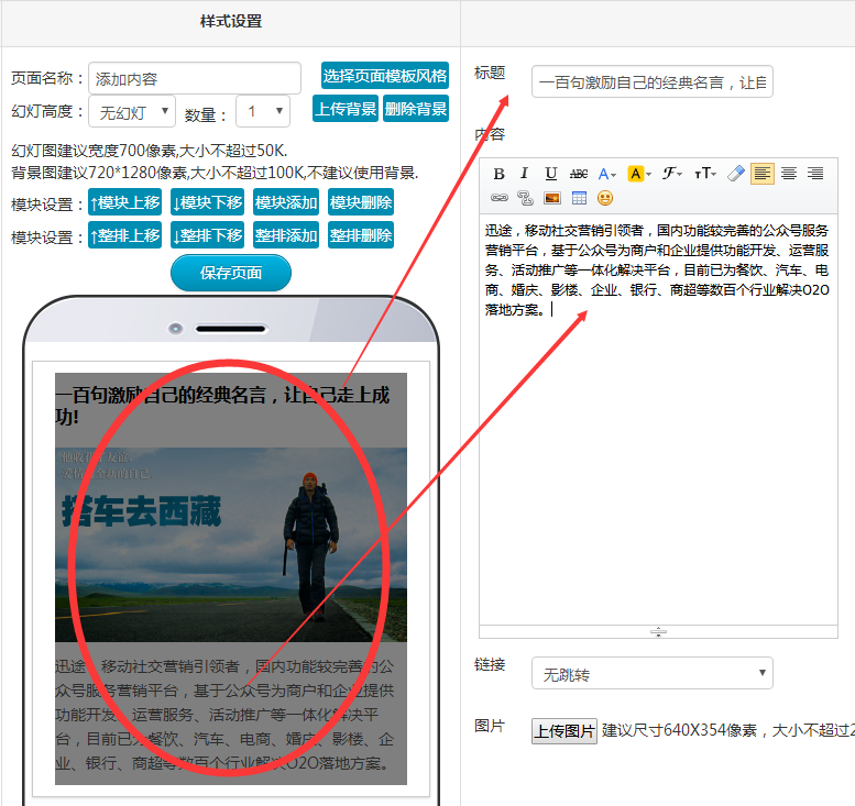 选择好图文模板后,在手机样式中选择好模块,同样在右侧就可以看到对应的内容标题,内容正文等,只要根据自己实际情况添加完整内容就可以了。是不是太简单了?(下图)