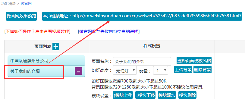 另外每个微官网页面都会有自己的独立链接地址,也就是说每个微官网的页面都是可以独立被其它地方进行跳转或调用展示。(下图)