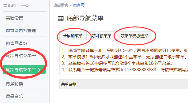 最后这里再提一下,微官网还可以添加页面底部的导航菜单,怎么添加的这里就不再展示说明,相信您会添加微官网的页面了,那么添加这个菜单就更加简单了。多看一下页面上的提示说明,很多问题在提示说明里已经有明确的解决方法噢!(下图)
