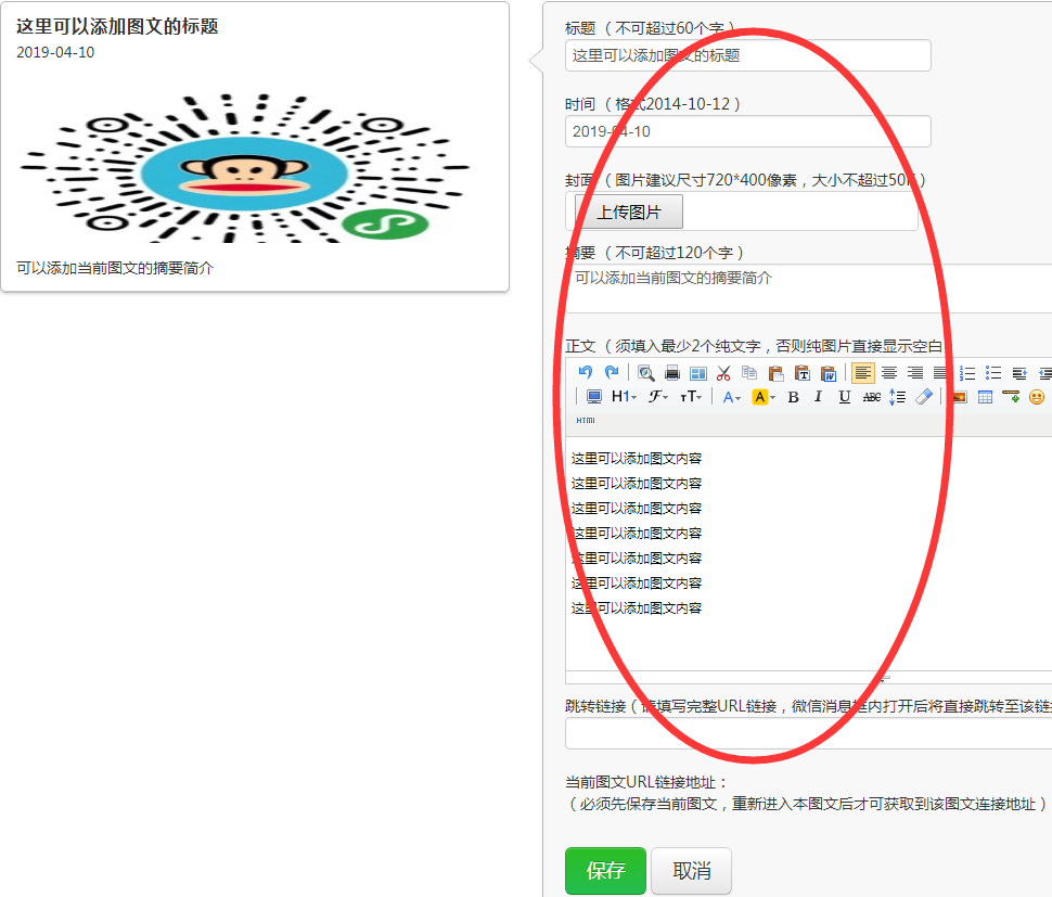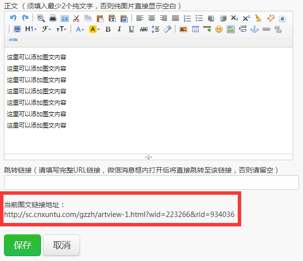 需要注意的是如果图文是第一次编辑,那是无法直接查看到当前图文的链接地址的,必须要保存后才会生成链接地址。(下图)