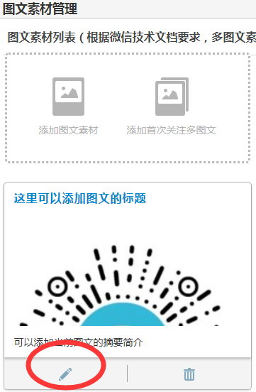 进入到图文素材,首先可以看到图文素材与首次关注多图文,我们一般常见的是添加图文素材即可,如果需要添加到首次关注功能里去的,那就添加首次关注多图文功能。一般情况下只要添加图文素材这一种即可。(下图)