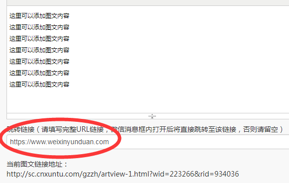 如果图文素材中添加了跳转链接地址,那在访问这个图文时将直接跳转至此跳转链接中,而不会直接显示当前图文的内容,如果没有这个跳转需要,请留空噢。(下图)