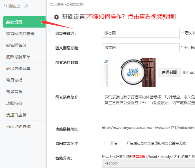 首先,如果你还没有注册过软盈,那么先自行进行注册登录后台,注册地址http://www.weixinyunduan.com/reg.html,注册和登录相关的一些操作这边就不重复赘述了,也是非常简单的。完成注册登陆后进入软盈后台,如果你是第一次登录,那么会提示你绑定公众号,如果有公众号的话可以直接点击绑定,然后按页面流程进行公众号绑定操作,也是非常简单的。如果你不想绑定公众号但是还是想使用软盈的微官网功能,那么也是可以的哦,点击绑定提示信息里面的"功能预览"直接进入到功能模块页面,然后找到微官网功能点击进入。左侧导航内会显示微官网功能的各个设置页面,首先完善基础设置(如果公众号不绑定可忽略这一步,因为基础设置是用于公众号内回复关键词打开功能使用的)。