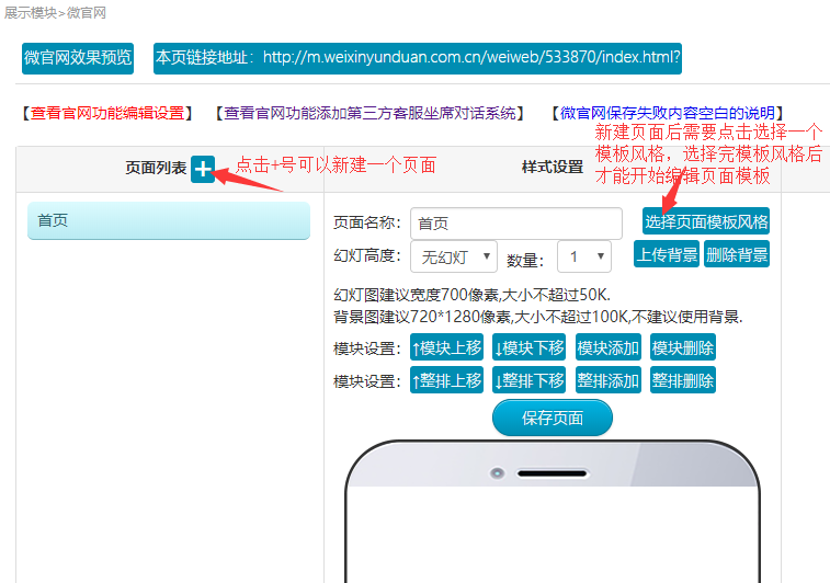 对于如何完善基础设置等这里就不再详细描述,页面上设置提示都非常清晰而且也很简单,接下来直接进入微官网的制作页面,点击左侧功能导航的微官网内容管理进入微官网的正式制作界面。点击页面上的+号可以添加微官网的页面,新建一个页面后点击右侧的选择页面模板风格按钮,选择一个模板后才能开始对当前页面进行编辑。微官网是每个页面都是单独独立编辑的,然后所有创建的微官网页面又可以相互连接,详细也可以看图片说明!