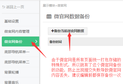 由于微官网的保存形式是所有官网页面统一打包存储的特殊保存形式,所以微官网功能内增加了备份功能,每次编辑模板前建议备份一次微官网,防止出现保存失败内容丢失的情况!