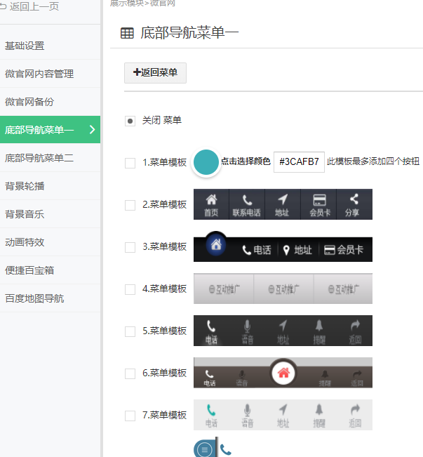底部导航菜单功能就是给微官网页面底部增加了一个导航的菜单栏,这个可根据实际需求来添加菜单按钮!