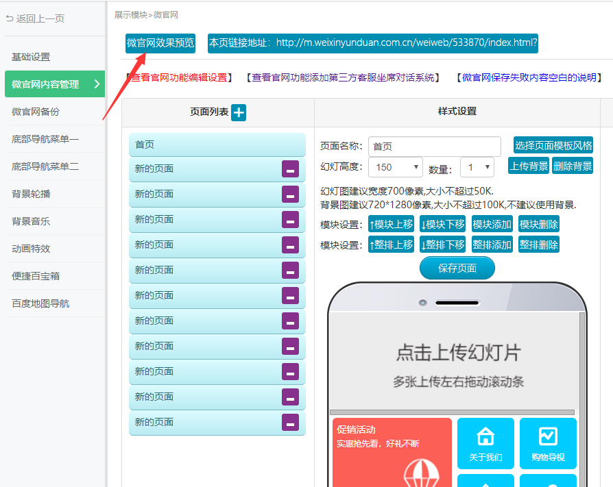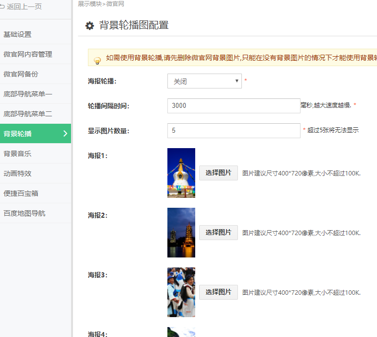 背景轮播图毫无疑问是给微官网页面添加上一个滚动轮播的图片背景,可以自己滚动显示,这个并非所有模板都可以支持,需要是通栏背景的模板才能实现背景轮播!这个也是根据实际需求来添加