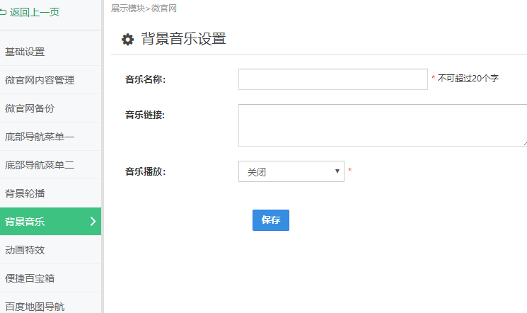 微官网还支持给你的微官网页面增加背景音乐播放,填写上音乐的链接地址即可,一般以.mp3结尾类型的连接!