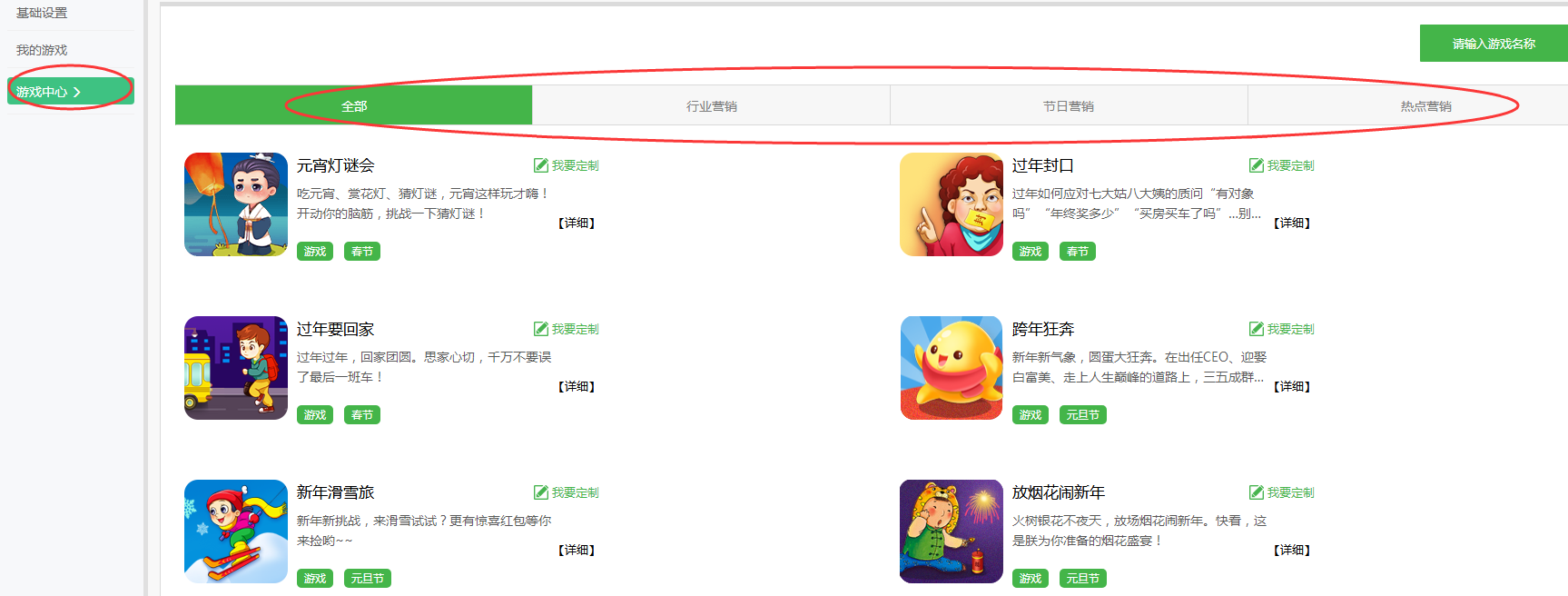 然后进入到游戏中心,就可以看到当前所能添加的游戏了,一般可以选择当前热门的节假日或某个特殊热点来选择游戏,也可以直接搜索某个游戏名称来快速查找。(下图)