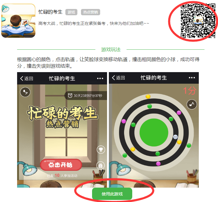 如果需要了解某个游戏的情况,可以点击“详细”按钮,便过进入到此游戏介绍说明,也可以直接扫二维码用手机体验此游戏的大概玩法,如果需要使用这个游戏,直接点击页面下方的“使用此游戏”按钮。(下二图)