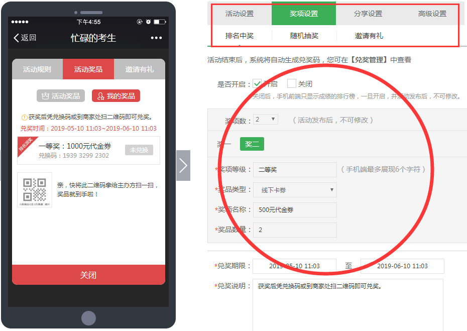 具体的活动设置、奖项设置以及分享设置等均可以设置,直接在编辑页面就可以查看到,并且里面也有详细的设置说明,只要按设置说明的要求进行编辑说明即可,比如奖项情况,排名情况在活动编辑前先策划好具体的数量,是否显示等,因为这些设置一旦开启后不能再次开启或显示。其它的一些设置只要按设置字段配置即可,这些都是非常简单的,编辑设置也不会太难,这里逐项说明了。(下图)