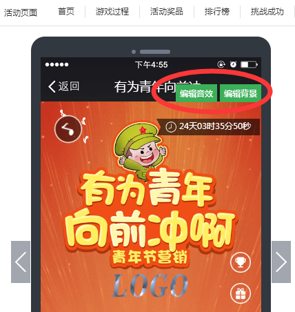 进入到游戏编辑页面,可以对游戏的各个流程页面进行独立编辑,比如鼠标移动页面上某个组件后,会有提示“样式、编辑、背景、音效”等组件编辑字段,点击这些字段便可对当前的组件进行编辑,需要注意的是并不是每个游戏页面都可进行自定义编辑,个别游戏页面只能使用固定样式。(下二图)