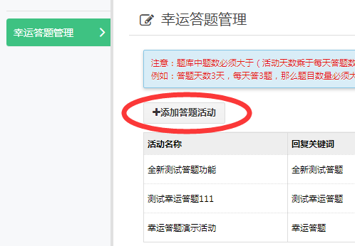 2、进入功能后,首先需要添加“答题活动”,系统允许添加多个答题活动,如果公众号运营者需要同时举行多套题库或不同主题的答题活动,那就非常方便了,一个答题主题对应一个答题活动。(下图不)