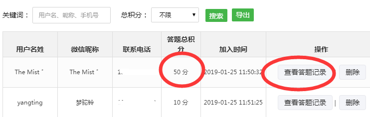 9、同样在答题活动后台,也可以看到答题结果,进入到答题结果页面,便可以看到每个人的答题总积分,商家可以以总积分由高到低或者由低到高来进行排序。同时还可以查看到当前答题者对每一题的答题选择记录。(下2图)