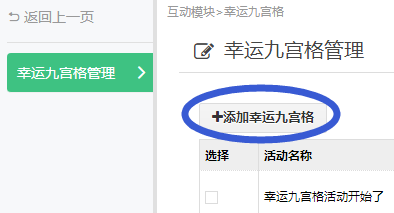 2、进入幸运九宫格功能后,点击“添加幸运九宫格”按钮,便可以进入活动创建的编辑步骤。(下图)
