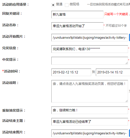 3、进入幸运九宫格活动编辑页面,只需要按字段的设置项目逐条填写完善便可,如果遇到不太明确的设置项目,多多注意查看阅读设置字段后的提示说明文字,总体上都是非常简单的,按说明要求填写就可以完成了。(下2图)