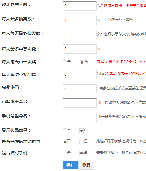 2、涉及中奖率参数的填写可以阅读关于中奖率说明的操作文档,凡是涉及到中奖率设置项目的参数在活动保存后不能二次修改。