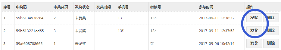 10、活动商家也可以在幸运九宫格后台的中奖结果中查看所有中奖用户,当中奖者提交中奖信息后,商家可以在这里对中奖身份进行发奖核销操作。(下2图)