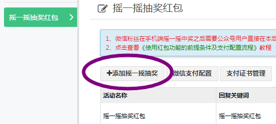 2、进入功能之后,首先就是添加活动了,点击“添加摇一摇抽奖”,就可以添加抽奖活动了,系统系统同时添加多个不同的抽奖活动呢!(下图)