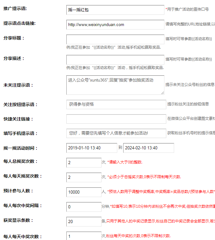 3、进入抽奖活动编辑之后,就可以直接按设置页面上的字段项目逐条添加完成就可以了,如果遇到有不明白的设置字段,直接查看后面的提示说明文字,按提示说明文字去操作便可以完成填写了,都是非常非常简单的。(下图)
