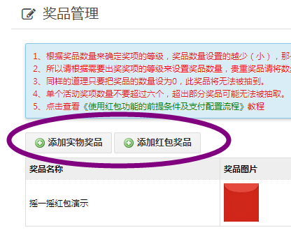 7、添加微信红包奖品的话,可以根据页面上的提示添加,当然有个前提就是当前绑定的公众号需要符合微信官方使用红包接口的条件。(下图)