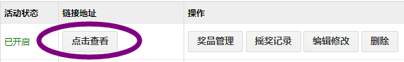 8、最后奖品也添加完成之后,在活动列表上就可以查看到当前活动的链接地址,公众号运营者可以将这个链接地址添加到自定义菜单、微信官方推送图文、或者直接生成二维码后放置入于活动入口处。(下图)