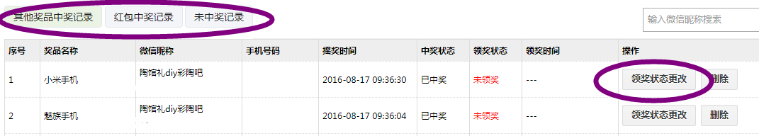 13、当手机端有中奖者提交中奖信息后,商家便可以在活动列表中的摇奖记录中查看到所有参与摇奖的记录,可以对中奖者的领奖状态进行变改,以确定是否领奖的核销操作。也可以在红包中奖记录中补发中奖者红包。(下2图)