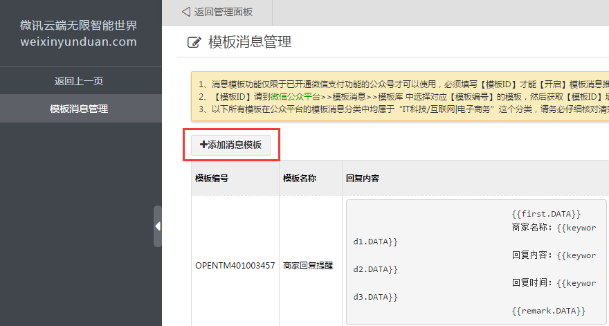 4、公众平台内添加模板成功后,在我的模板中就可以找到刚刚添加的模板了,同时再复制一下这个模板的ID,这个模板ID是需要添加到软盈平台内的模板消息里去的。