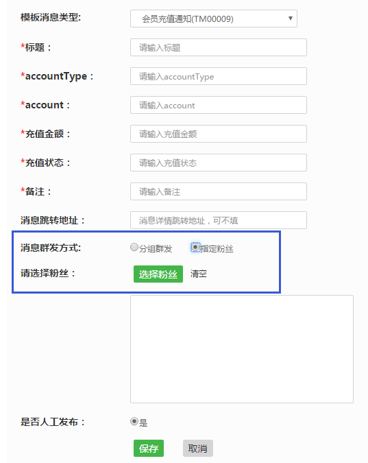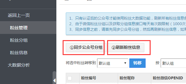 2、如果在设置模板消息群发时,选择消息发送方式时,无论选择分组发送还是指定粉丝发送,请到粉丝大数据功能中去先同步好公众号内的粉丝分组信息,然后再刷新一下粉丝的信息,这样在选择消息发送方式时,被发送粉丝的选择才会有效。