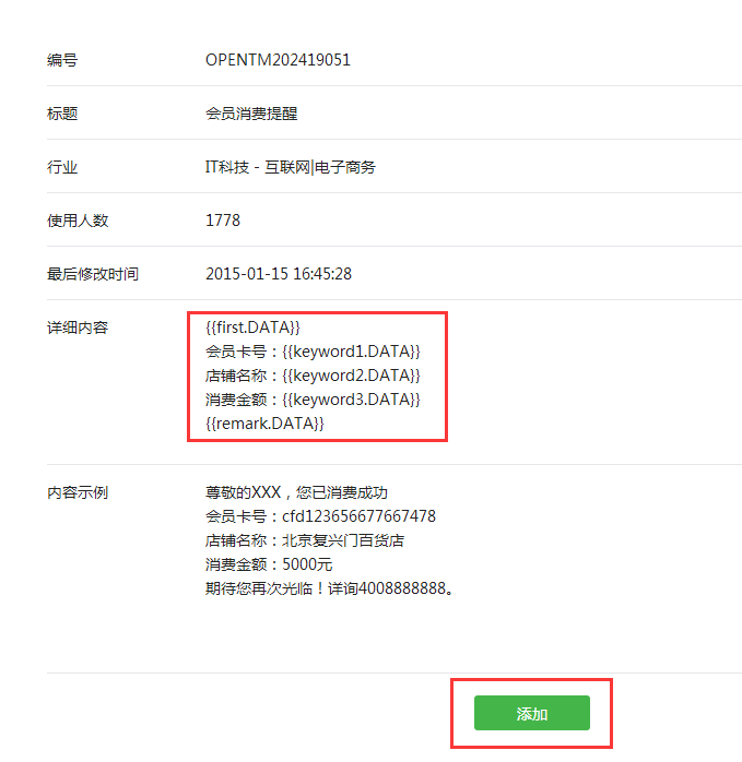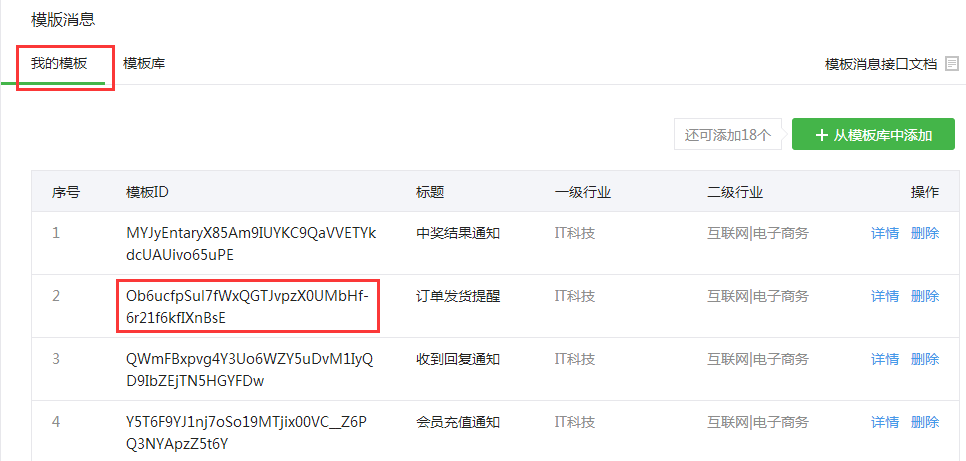 3、选择好模板消息的行业之后,直接在模板库中找到第1条里记功能内所提供的模板编号,不同功能内集成的模板编号不同,请必务核对模板库内的模板编号是否一致。找到模板编号一致的模板后,点击详情进入模板内容页。同样复制好详细内容中的模板参数格式,直接复制即可,最后添加。