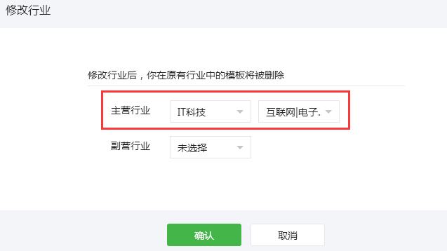 2、登录微信公众平台内,在模板消息插件中首先选择好主行业,我们平台的功能内需要使用到的模板消息统为“IT科技/互联网|电子商务”这个分类,如下图选择好这个分类。