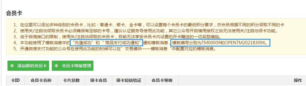 1、首先在功能模块中找到功能里所提供的模板编号,这里以会员卡功能为例,如下图所示记录好模板的编号。如果在功能页面没有提示模板编号,则说明当前功能无模板消息发送通知。