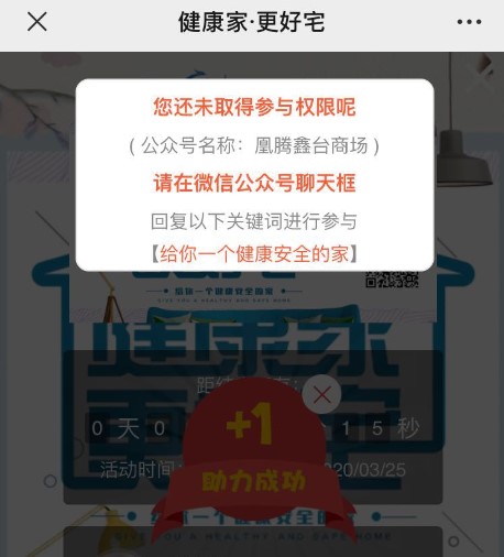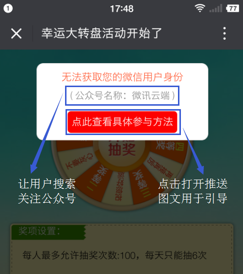 当上述流程设置结束后,在手机端打开活动链接进入功能页面,系统会自动判断微信用户是否关注了公众号,如果没有关注公众号,系统会自动弹出无法参与活动的提示,微信用户根据提示关注好公众号后,就可以正常打开活动页面参与了。