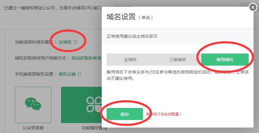 二、在管理面板中,找到当前选择域名模式中,选择“备用域名”模式,最后保存。下图所示