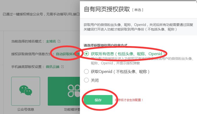 三、同样在管理面板中,找到授权获取微信用户信息方式中,选择“获取所有信息"模式,最后保存。下图所示
