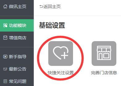 五、再回到软盈,在功能模块中找到快捷关注设置模块,同时将从公众平台中复制到的官方图文链接粘贴至此。下二图所示