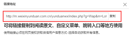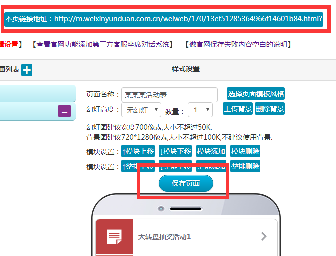 4、当这个页面编辑完成之后,请记得保存一下,最后就可以将本页链接地址复制出来,这个本页链接地址就是当前页面的链接,将这个链接放置到用户入口即可,比如自定义菜单、公众平台官方推送图文及原文阅读,或也可以生成二维码直接放置于网页和宣传物料中。(下图)