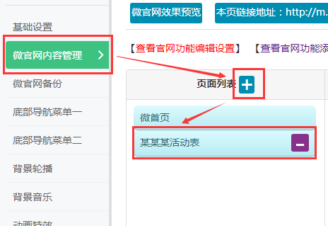 2、再到功能模块-展示模块-高级微官网(微官网)功能内去创建页面,将不同的活动链接添加到一起。(下图)