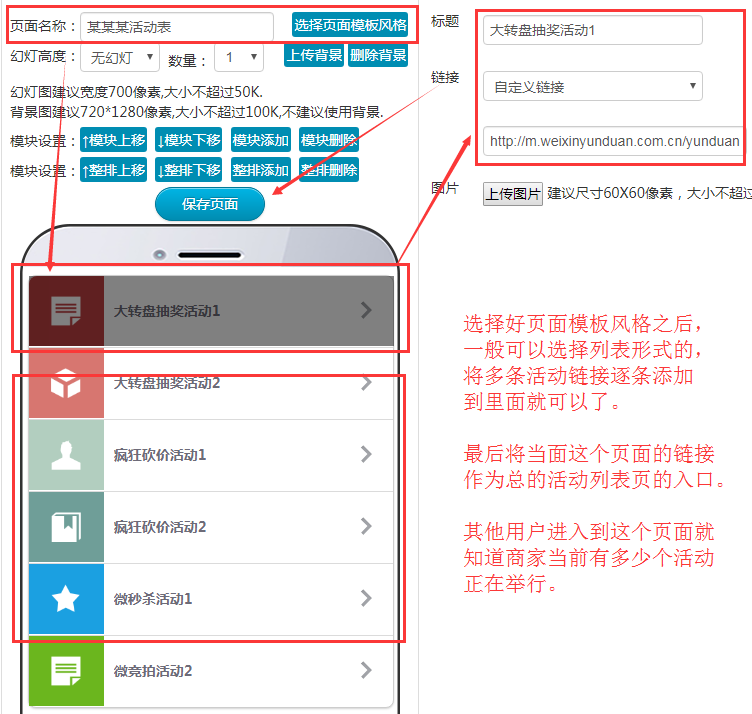 3、上一步中添加好页面之后,接着在选择页面模板风格中选择好模板,将多条活动链接分别添加到这个页面的模块中就可以了,页面上的每个模块都可以修改标题、链接、以及图标、当然不同的页面模板风格有少许差异,这个您可以自己选择。(下图)