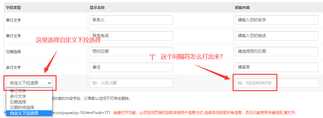 各位小伙伴们,大家都知道通过微信第三方功能可以给自己的公众号添加一些预约、报名、表单提交的功能,比如我们平台上的微预约功能就可以实现表单提交,那在给微预约添加提交字段的编辑时,有很多小伙伴们都不知道其中的一个自定义下拉选择字段怎么给选项内容进行分行间隔,或者通俗的讲就是“|”这个符号不知道怎么打,键盘上找不到这个符号。