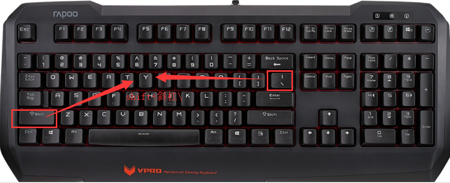 然后在键盘上找到“”按钮,同时还需要按住上档键shift,再按斜杠键就可以了,按键组合为shift+,就可以打出"|" 这个了。如下图: