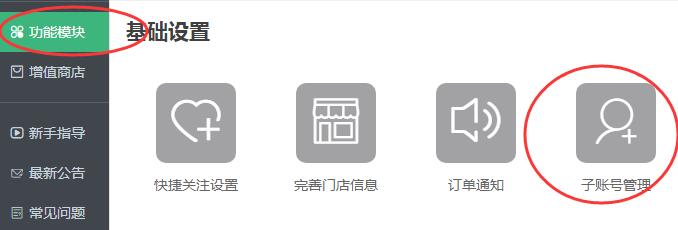 第一步、用总账号登录软盈后,在功能模块中找到点击“子账号管理”按钮。下图所示