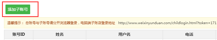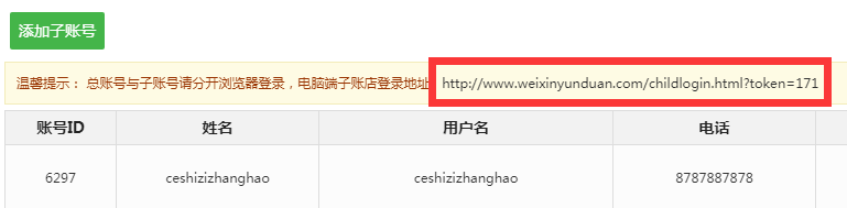 第三步、子账号添加完成后,在子账号列表页面,复制子账号登录地址,请注意子账号登录所用的浏览器需要与总账号或其它子账号分开。下图所示