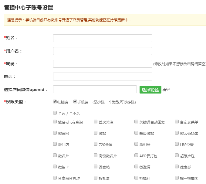这个可以用子账号功能极大的方便了公众号运营管理者,子账号功能主要的作用是给下属分配不同的功能操作权限,可以分别对不同的员工分配不同的账号操作权限。