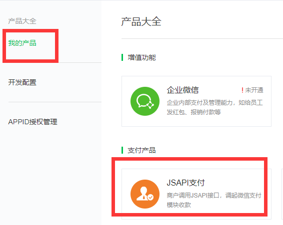 1、微信商户平台-产品中心-我的产品。在支付产品里选择“JSAPI支付”,然后开通这个微信支付产品。示意图如下: