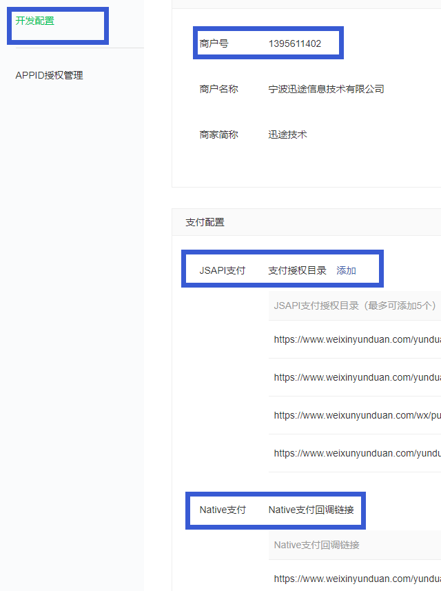 2、微信商户平台-产品中心-开发配置。获取商户号,将“商户号”复制保留下来以备后用。在支付配置,添加支付授权目录及支付回调链接。示意图如下: