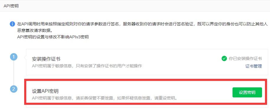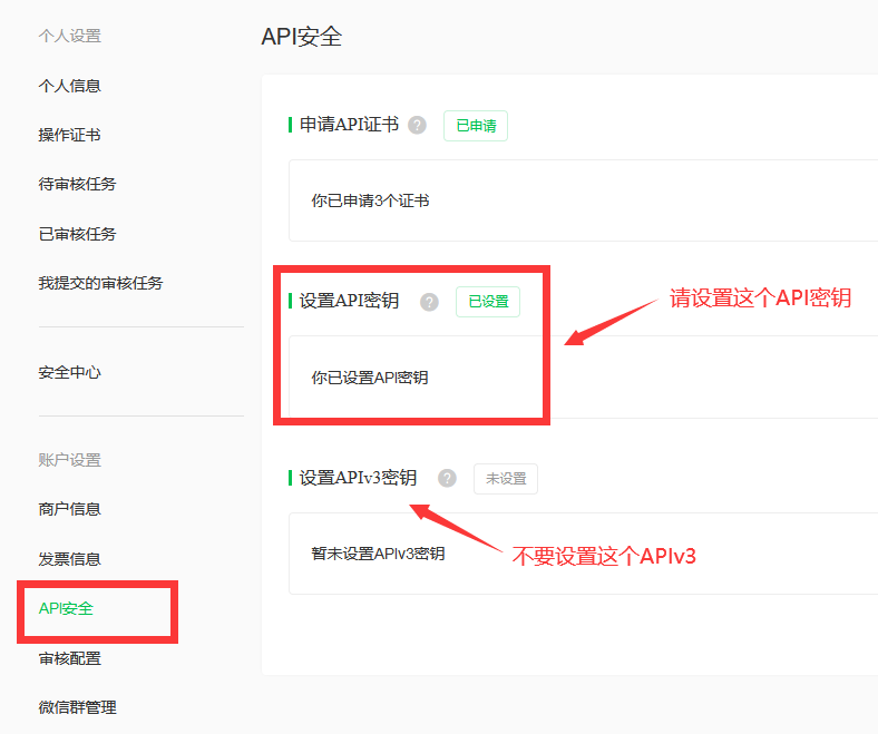 设置API密钥,此密钥需要微信支付管理员自行添加。示意图如下: