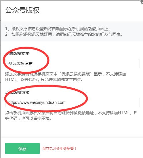 在版权信息编辑页面,可以对版权文字以及点击版权后跳转的链接进行修改或留空。