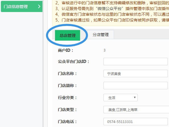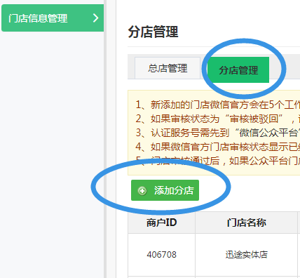 三、如果除了主店外,还有关联分店,那请到分店管理内,点击添加分店,便可以添加完善分店的信息,填写的信息与主店填写一样。(下图)